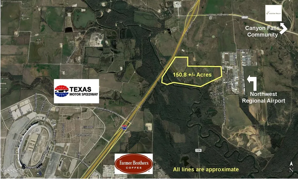 150.8 Acres, approximately 138 Acres net. 1.25 per sqft on net acreage. Will divide 20 acres on East side at 2 per sqft. West portion zoned mixed use, East portion commercial, town of Northlake. East side fronts Cleveland Gibbs, West side I-35W. Service road is in planning stages. One of the hottest locations in the metroplex! No water or sewer.