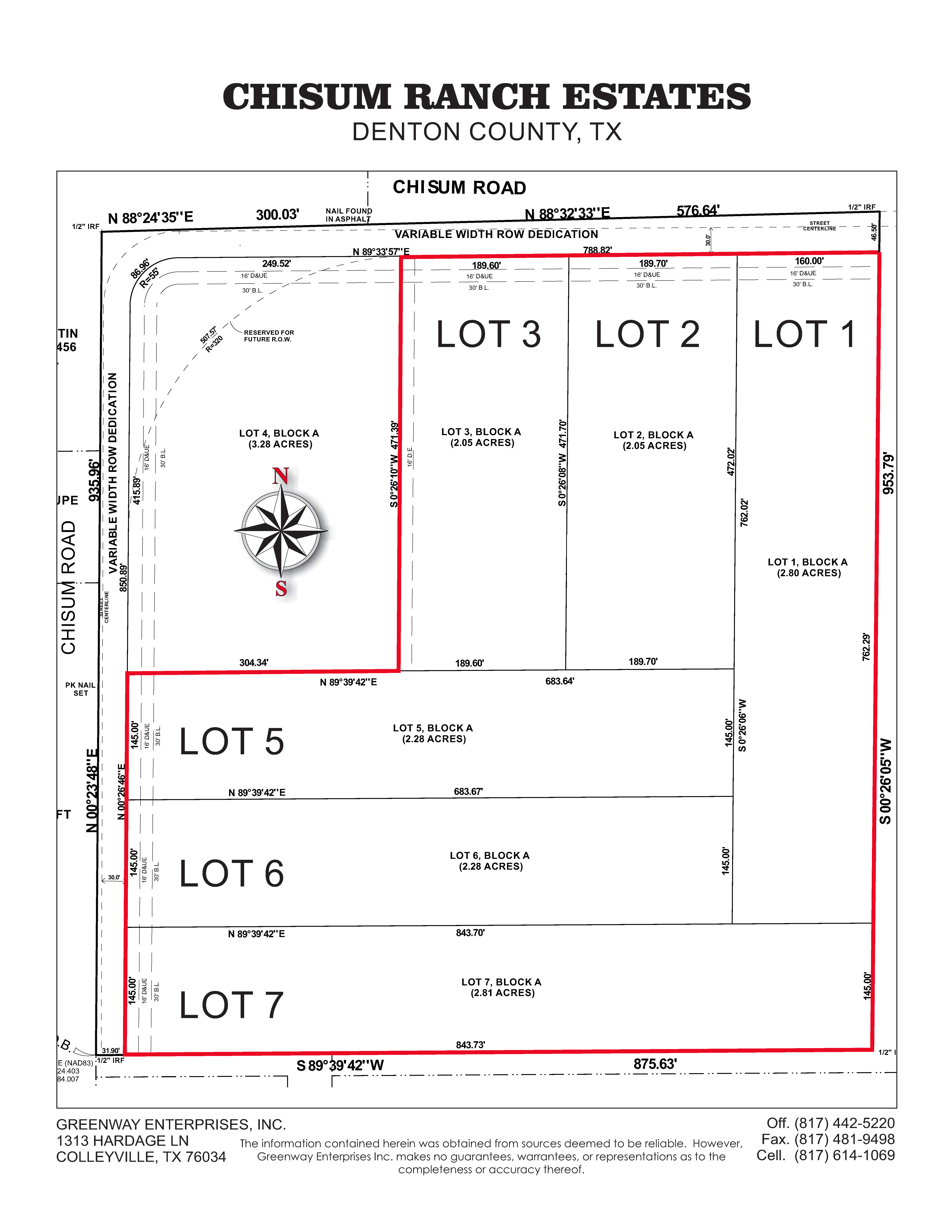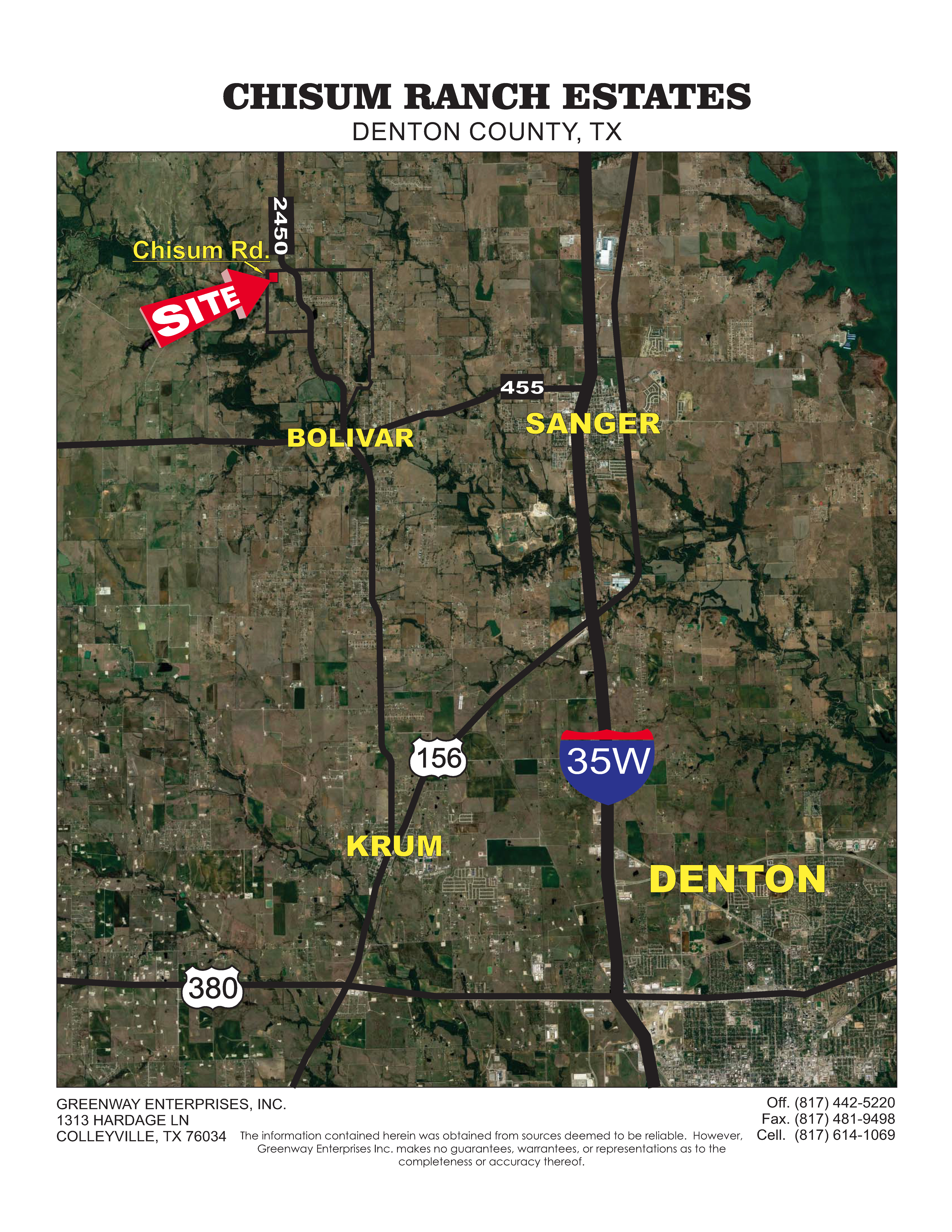 Clean and attractive Single Family residential acreage in Denton County with 145' of frontage along Chisum Rd. Restrictions do not allow mobile homes or commercial activities. We have a few lots available as shown on the plat.