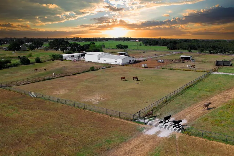 Horses grazing in the pastures and near new DNT and Collin North Loop. This 5.7 acre property has been utilized as an equestrian boarding ranch for more than 30 years and is well known to families in the Frisco, Prosper, Celina, and Aubrey area as a top of the line home for their horses. Great layout for boarding, breeding, training and or riding school. The horse boarding business conveys steady monthly income. 40x45 metal workshop, 16 ft high, cable slab, foam insulation and space for RV, dually AND boat. The two post car lift, plumbed air compressor and 220 volt power are added features. Each paddock has a gated 3 sided shelter. Roomy barn with 4 foaling stalls, tack room, storage.