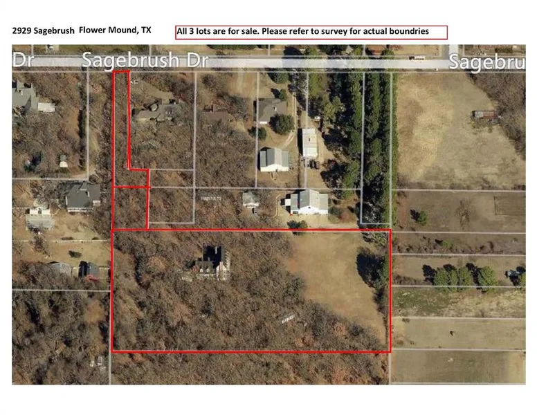 A remarkable 5.4-acres nestled in the heart of Flower Mound, close to FM 2499 and FM 1171. This picturesque property boasts an abundance of trees and enchanting wildlife, including wild peacocks. With flat terrain and easy access to Long Prairie Rd (FM 2499) via Sagebrush Dr. this land offers great possibilities for development. Water and utilities are readily accessible, paving the way for development. Whether you envision an age-restricted community, an assisted care facility, or exquisite single-family residences, this versatile acreage can bring your vision to life. Adjacent to this remarkable parcel, you will find two additional connecting acreages ‹“ 2.59 acres to the north and 7 acres to the south. Imagine the potential of combining all three plots, creating a sprawling 14-acre development that is truly one-of-a-kind. Don't miss the chance to be a part of something extraordinary. Secure 2929 Sagebrush Dr. for your next venture and unlock the limitless possibilities it holds.