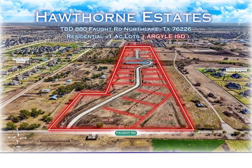 UPDATE: The Subdivision is wrapping up final details, Multiple lots have already been sold. Contact most updated Lot Availability ( Not All Lots Are Listed )!! ARGLYE ISD, BRING OWN BUILDER & NO REQUIRED START DATE !!Discover the perfect blend of tranquility and convenience at Hawthorne Estates, Located at 880 Faught Rd, brand-new community nestled in the heart of Northlake, Texas. With 27 spacious lots ranging from .9 to 1.27 acres, this haven offers a peaceful and scenic retreat for homeowners.One of Hawthorne Estates' standout features is its location within the prestigious Argyle ISD School District, renowned for being one of Texas's highest-rated school districts. An excellent education right at your doorstep, ensuring a bright future.Furthermore, this community offers easy access to nearby shopping centers and highways, making daily errands and weekend outings a breeze. Immerse yourself in the serenity of Hawthorne Estates while staying connected to the conveniences of modern life.A Destination Ready to be Called Home!