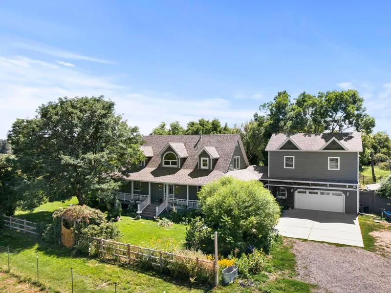 The farm home has a charming wrap around porch for your afternoon lemonade or iced tea! The open floorplan and vaulted ceilings makes entertaining guests comfortable and easy. The home has a main floor primary suite with connecting study, and its own laundry! The main floor his heated via a radiant floor heating system. Two bedrooms and a full bathroom are upstairs. The kitchen has abundant counter space and a butcher block island; custom oak shaker cabinets; high-end appliances; a gas range; and a secondary prep sink. The basement is freshly painted and offers an excellent option for workout equipment, home theater arrangement, and a craft room. The 2 car attached garage is oversized and there is also plenty of parking in front of the home and on the driveway. You will also love the extra mother-in-law apartment over the garage for visiting guests, a farm/ranch manager, or optional rental income.