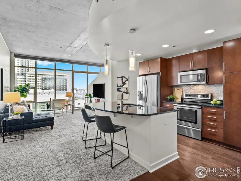 LIVE IN THE HEART OF DOWNTOWN DENVER WITH AMAZING VIEWS! PARKING INCLUDED! This must-see 1-bedroom SPIRE condo has nearly 900 square feet of living area with high ceilings, floor-to-ceiling windows, and tons of natural light. This 23rd-floor residence includes your own personal balcony with views of Downtown Denver, the Rocky Mountains and beyond! Imagine coming home after a long day or work or shopping and relaxing with a glass of wine on the balcony as the sun sets. A built-in granite computer nook, along with lightning-fast internet speeds, makes for the perfect work-from-home solution. The chef's kitchen features warm wood cabinets, granite countertops + island, and stainless-steel appliances. The bedroom has more of those floor-to-ceiling windows, a ceiling fan, and abundant closet space nearby. Also nearby, a full-sized washer & dryer. Also included: 1 parking space and 1 storage s...