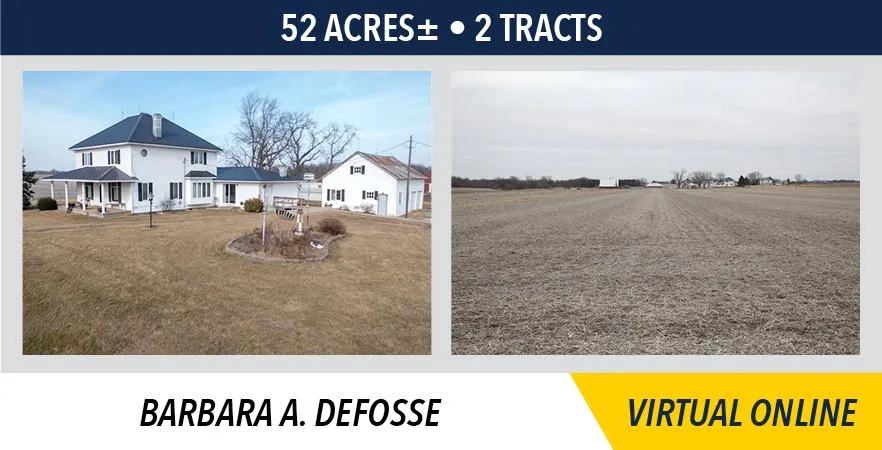 The farm consists of 52 acres (subject to survey) which will be sold in 2 tracts. Tract 1 will offer a beautiful, very well maintained country home and several outbuildings all situated on 5 acres. Tract 2 includes 47 acres of nearly 100% tillable farmland with an average CSR2 of over 80...