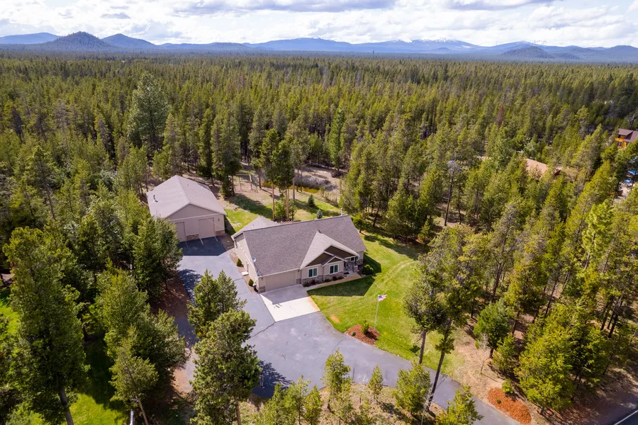 Open Sat. and Sun 12-2. Gorgeous pine trees + wildlife set the stage for this 2 acre property with a great single-level home + a massive man-cave/shop. Located in Lazy River West, just S. of Sunriver Resort, the home is 3 bedrooms + office, 2 baths & over 2000 sq. ft. of interior space. Vaulted ceilings with a no-fuss pellet stove & a well appointed kitchen with bar top + 2 pantries. The dining area & living are oriented to open to the back making afternoons on the large deck perfect for entertaining & enjoying life. Nice separation of bedrooms with a spacious primary offering a large soaking tub & separate shower. All of that is matched w/ a shop that dreams are made of! 2400 Sq. Ft. shop with a couple of living-style rooms plus a full bath. Potential to make this into a formal ADU. The shop has it's own heat source, hot water heater + enough space for all your toys + your RV with 2 huge 15' rolling doors. Prvt. well + septic. Truly a 'living in the woods' life, but w/ all the modern conveniences!