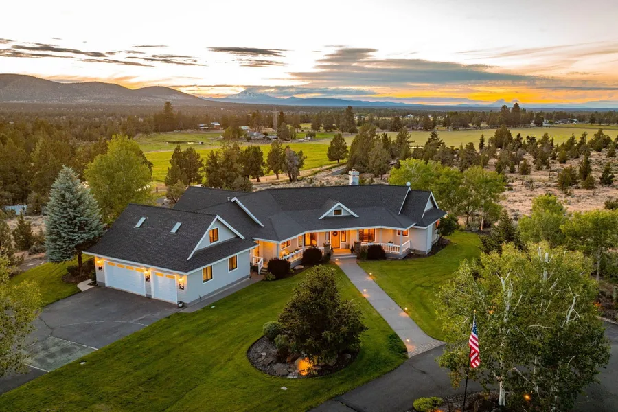 Wonderful Horse Property/Hobby Ranch on 45 gently sloping acres w/18.45 acres of irrigation & sweeping views of the Cascades (6 peaks!) Conveniently located between Bend & Redmond this beautifully landscaped, Sun Forest NW style custom home features dramatic floor to ceiling windows, wood beam accents & stone fireplace. This mostly main floor living features an Open Great Room, Chef's kitchen, dining area, breakfast nook, office, Primary Suite w/ Luxurious bath, 4 guest rooms, 2 guest baths & a huge Bonus Room above the 3 car garage. Expansive outdoor deck, w/stunning mountain views overlooks the green pastures. This property is perfect for entertaining & soaking in the beautiful High Desert topography, stunning scenery and wildlife. Gated w/ a asphalt drive, the property also features an artisan studio, large barn w/2 stalls, hot/cold water, tack room & storage. Lovely irrigation pond, ...