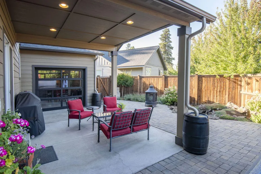 A Spirited home on a Unique flag lot. Creatively designed for highest use, this home offers one of the coolest outdoor spaces with a roll up garage door opening to the back patio - belly up to the bar boys! This man cave / she shed is ideal for your craft, your friends, your fun! Hot tub and water feature out back invite you to play. The home is a perfect layout with an open floor concept on main level including 1/2 bath and large pantry. Top floor offers 3 bedrooms, 2 full baths (including the primary), a laundry room and that second shared space for TV/gym/office/work from home. The oversized two car garage with workshop inspires PLUS the greenhouse and raised beds. Everything is here! Walkable to Sawyer Park, Riley Ranch, Deschutes River Trail, such a great location!