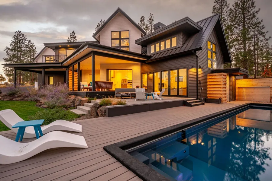 Nestled in Westgate on 2.5 acres, this custom-built farmhouse blends New England architecture with casual West Coast style. Designed to capture light year-round, it offers daily sunrises while keeping the yard as an oasis from summer heat and winter wind. Inside, find 3 bedrooms plus a versatile office/guest suite, mudroom, pantry, work nook, reading bench, and more. At its heart, a well-appointed kitchen opens to the great room and outdoor living with seamless flow. In the backyard playground, enjoy a four season 40-foot pool, hot tub, outdoor shower, powder room, natural bouldering wall, and scenic perch. For adventurers, the 4+ car garage and van port provide ample storage. Green features include an 8.8KW solar array, Havelock Wool insulation, heat pump, and induction cooktop. With easy access to Shevlin Park, Phil's Trail, and top schools, this west Bend estate is ideal for living, working, and playing.