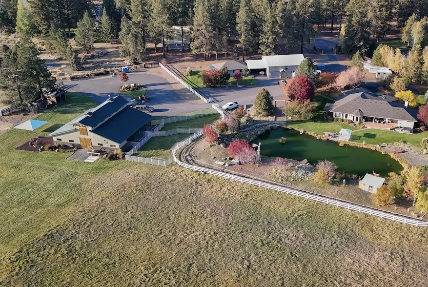 Single level home; 3-car garage; 40'x50' finished shop with 14' doors and service pit; 792 sf detached office/studio with 2-wide carport. Barn built in 2020. 150'x250' arena. 15 acres water rights. 100'x40' lined pond with cascading water feature. Two 10-acre tax parcels. End of road location. Within a mile of downtown Sisters, on the Barclay Meadow, tranquility so close to town. Primary bathroom with large walk-in double shower and heated floors. Formal dining room/office. Family room with free-standing propane fireplace. Separate living room with wood-burning fireplace. Copious large windows look out on expansive yard, meadow, pond with water feature, partial views of the mountains & barn. New roof/gutters. New furnace in 2018. Two full RV hook-ups, a third without sewer. Two private wells. Extensive landscaping & irrigation. Barn: 6 stalls, H&C wash station, hay & utility, double dutc...