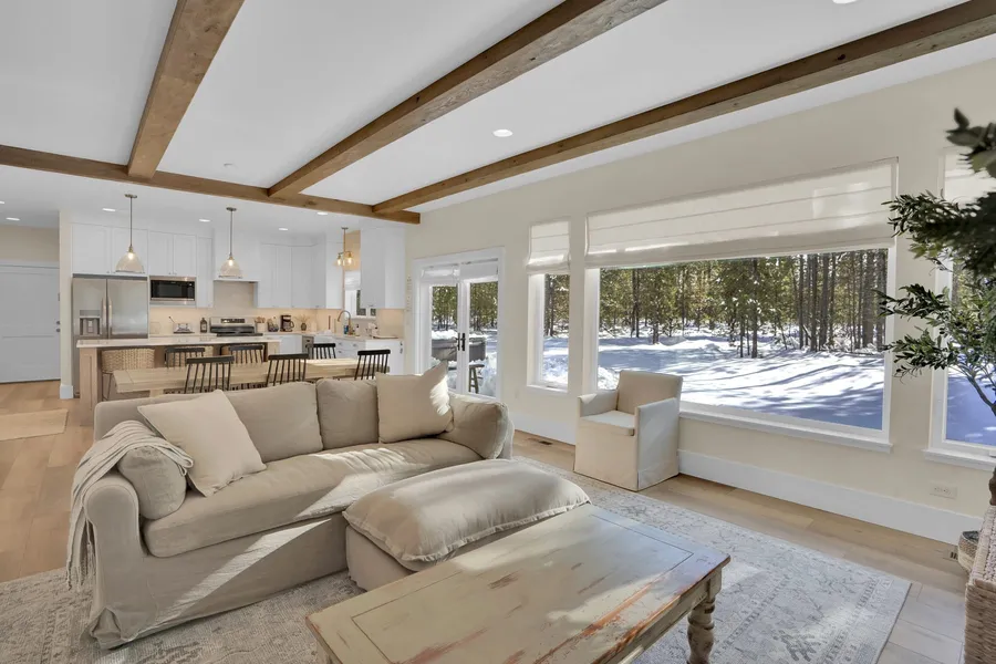 Stunning custom home in nature's playground, designed for owners and vacationers alike. The cheerful and welcoming entry leads you past a beautiful custom staircase opening to a light-filled great room with modern architecture. A custom oak-beamed ceiling adds to the warmth and character of the space. The clean, elegant kitchen boasts stainless appliances, farmhouse sink, brushed brass hardware, solid surface counters, and a large island for entertaining. The breathtaking second-floor primary suite offers a private deck, spa-like bath, and large walk-in closet. With 5 BRs, 3 BAs, AC, hot tub, EV charger, and potential for future buildout above the garage, it's perfect for family or rental use. The backyard abuts Deschutes National Forest, with a 3-min walk to the Deschutes River. Enjoy the community boat ramp, hiking, snowmobiling, and moreMt. Bachelor is 30 mins away, Sunriver Village 1...