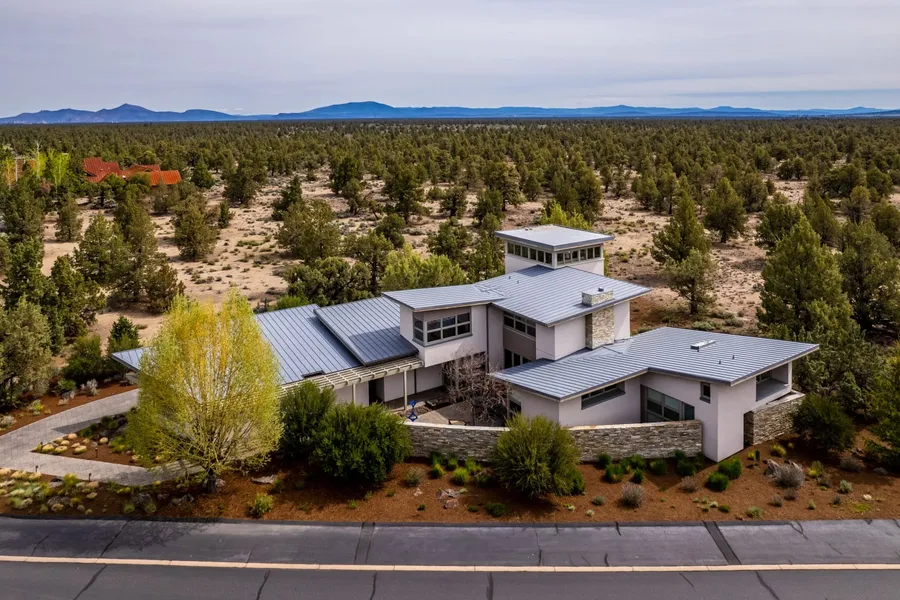 Stunning contemporary home, designed by Emmens Architecture, harmonizes beautifully w/its High Desert surroundings. At 4,336 sq. ft, this exquisite 4-bedroom home welcomes you through the front courtyard, immersing you in intricate design details & refined materials. The thoughtful layout features a primary suite on the main floor without a 2nd story above; 3 additional bedrooms & bonus room occupy the 2nd floor of the north wing, culminating in the 3rd-floor Aerie, aptly named ''Eagle's Nest,'' offering sweeping panoramic views of the Cascade Mountains, Powell Buttes, & Smith Rock. A private, 2-person office, adds functionality to this impressive home. Sun Forest expertly executed the owners' & architect's vision, utilizing soaring interior spaces that seamlessly connect to the outdoors. Noteworthy elements include, nine-foot doors and large, picturesque windows & glass doors that flood the home with natural light, all complemented by an extensive array of high-quality materials.