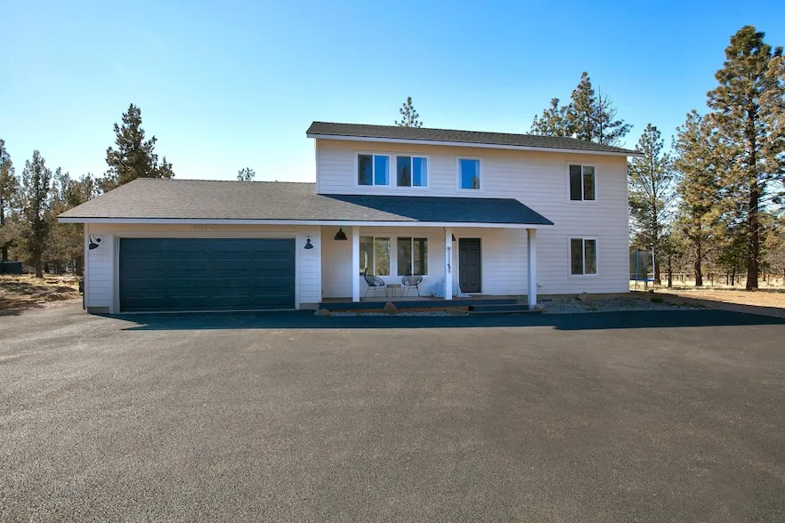 This beautifully upgraded 4-bedroom home on 4.34 acres in Sisters features a spacious great room and a stylish kitchen with stainless steel appliances. The dining area opens to a large backyard, ideal for outdoor activities. The main floor includes a primary suite with a spacious bathroom and walk-in closet. Upstairs, you'll find a large bonus room, three guest bedrooms with ample closets, a utility room with washer/dryer, and a conveniently located guest bathroom. Recent updates include a paved driveway, new interior floors, and Trex decking. Additional highlights include heat pump, a newer well, ample parking, a detached heated/insulated well house, and a thoughtfully designed chicken coop area. Enjoy peaceful country living just minutes from downtown!