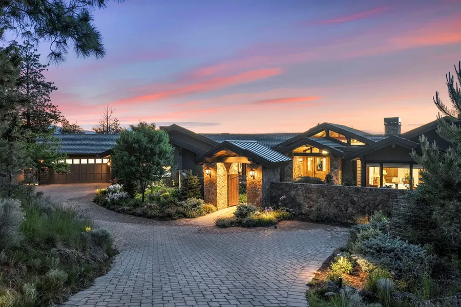 Extraordinary, single-level NW Lodge-Style retreat in exclusive North Rim. Built by Norman Building & Design, this timeless 4,515 ft masterpiece blends luxury finishes and artisan craftsmanship while capturing panoramic Cascade Mountain views from almost every room. Lushly landscaped courtyard w/trickling waterfall. Open Great Room features vaulted ceilings, dramatic wood beams, walls of glass and massive stone fireplace. Elegant dining space flows into a Gourmet kitchen w/ massive island, custom cabinetry, premium appliances and Butlers pantry. Expansive covered deck w/outdoor fireplace and fire pit, perfect for enjoying the stunning mountain sunsets. Two vaulted Primary Suites, situated on either end of the home, both feature grand fireplaces, spa-like baths, and their own private study. Spacious Guest Suite w/sitting area and separate entrance. Work out room, ample 4-car garage. Set against a stunning backdrop of high desert beauty, this exquisite home is your dream come true!