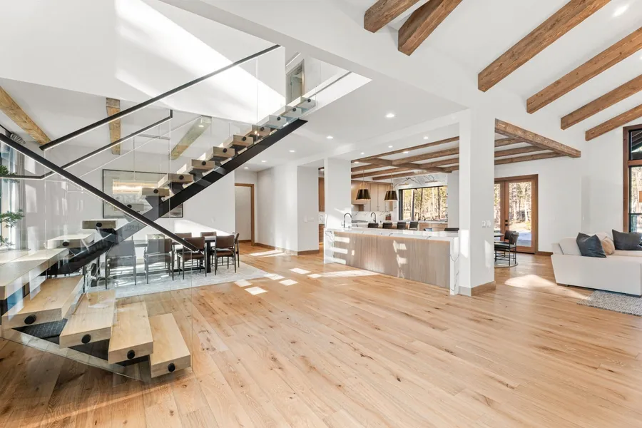 Experience lake views from this newly completed custom mountain-modern home in Caldera Springs! Designed for memorable gatherings, it features four ensuite bedrooms on the main level, a spacious great room, a gourmet kitchen with a butler's pantry, and a convenient laundry room. Upstairs, discover two additional ensuite bedrooms, bunk room and a versatile bonus room. Relax on the expansive covered patio, complete with a hot tub enclosure. Features include distress wood beams, custom cabinetry, rich woods, solid surfaces, high end appliances, and Central Vacuum with an in-wall hose, built in fridge and wi-fi enabled zoned Central A/C. Schedule a showing with your real estate professional to experience this home today!