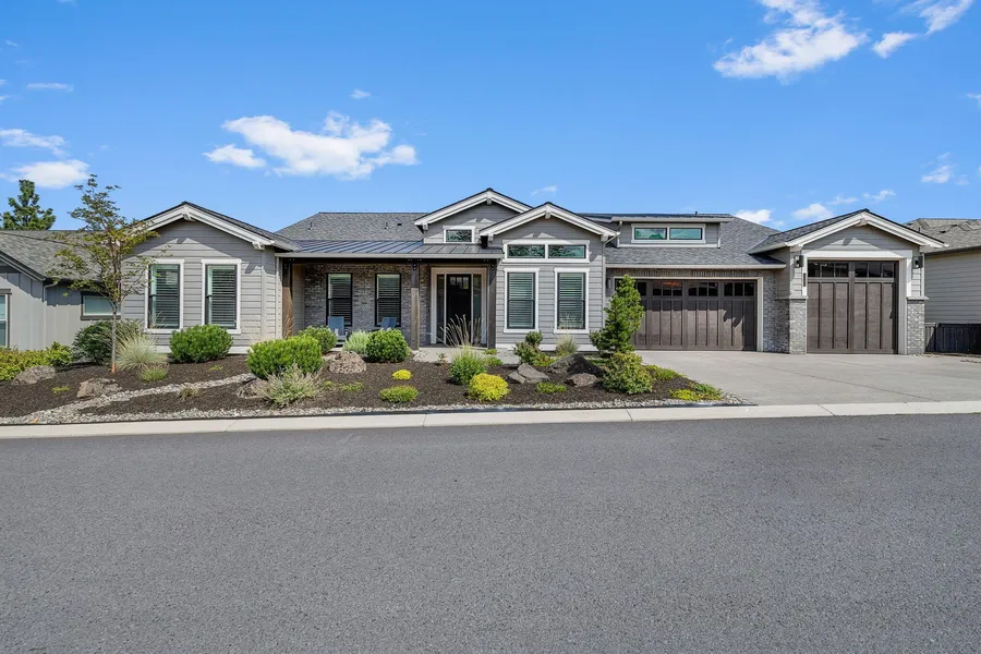 This award-winning Brennan plan by Pahlisch Homes in River's Edge offers 3,373 sq ft of single-level living with 4 bedrooms, a flex room, and a den. The open-concept design highlights 10 ft ceilings with beams in the main living area and a chef's kitchen with premium Jenn Air appliances. A large heated covered patio showcases stunning views of the Ochocos and Pilot Butte, ideal for year-round enjoyment. The luxurious primary suite features dual vanities, soaking tub, tiled shower, and walk-in closet, while secondary bedrooms provide comfort and privacy. Ample storage is found throughout, including a 3-car garage with epoxy finish, plus a third bay featuring a 10 ft door for larger vehicles or gear. Located in the River's Edge community, residents enjoy trails, open spaces, and proximity to the Deschutes River, golf, and vibrant downtown Bend.