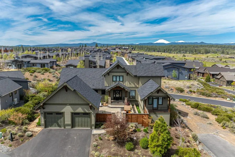 Framed by sweeping Cascade Mountain views and open park space, this French farmhouse-inspired home in Tetherow offers a refined take on westside living. Thoughtfully designed with a flexible layout, it features two main-level bedrooms (including a primary suite with dual walk-in closets), a lower-level guest bedroom and bath, and an upstairs flex room with closet which easily doubles as an additional bedroom to accommodate guests, work, or extended stays. Vaulted ceilings and curated finishes echo timeless charm, while the enclosed courtyard patio and rear deck space invite a connection to the landscape. Also, with an oversized mudroom and three car tandem garage with built-ins, there is no shortage of room for your gear. Located on a quiet .40-acre lot with direct trail access and minutes from Mt. Bachelor, the Cascade Lakes, and downtown Bend, this home has a quiet elegance while offer...