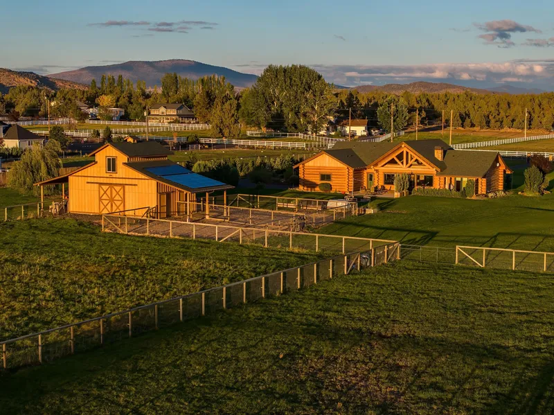 Discover your ideal Central Oregon property in the highly sought after Equestrian Meadows, suitable for horse lovers and those seeking a country lifestyle near Redmond, Oregon! This stunning, single-level log home offers comfortable, luxury living space on 6 acres+underground irrigation, & open, expansive views of the Cascade Mountains! This custom-built home features a fully-owned Solar System, Central Vac, private primary suite with French Door accesses to the back deck, and an impressive Great Room area with everyone's Dream Kitchen space! Upon property entry through the iron gate, you'll notice this gorgeously manicured estate, cross-fenced and complete with a 2 stall Barn + heated Tack room & Pasture. Property has plenty of room for privacy, storage, outdoor leisure w/ a Cozy Fire Pit, and space for animals. Soak in the scenery from the covered Trex front and back porches, perfect for relaxing or entertaining. Don't miss the RARE opportunity to live in this coveted neighborhood