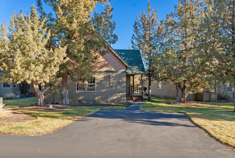 Eagle Crest chalet w/golf course views overlooking the 17th green & down the fairway. Partially furnished! Heat pump & furnace replaced in 2016. Spacious grassy area just off the large Trex deck--ideal for outdoor living. HOA-maintained exterior updates- new roof (2025), exterior paint (2023), and Trex decking & railing (2023). The interior offers 1,328 sq ft w/a functional two-level layout (936 sq ft main level, 392 sq ft upper). The main level features a bedroom w/large closet, full bath w/walk-in glass shower & stone floors, tile kitchen w/stainless appliances & laminate counters, tile dining area, laundry room w/cabinetry, and a great room w/cathedral ceilings & a gas fireplace. The upper level has a second bedroom w/vaulted ceiling & built-in storage, a full bath w/soaker tub, walk-in shower, stone floors, single vanity, & a loft w/additional storage. HOA amenities include pools, fi...