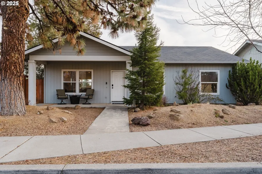 Open house Sat 2/21, Sun 2/22, 12-2 pm. Fresh interior paint! Home warranty included. Super private, cozy mountain-modern bungalow in sought-after SE Bend Larkspur neighborhood, featuring an open and inviting floor plan. This 3-bedroom, 2-bath home offers a spacious great room, 9' ceilings throughout and a natural gas fireplace that seamlessly connects the living, dining, and kitchen areas. The kitchen features stylish butcher-block countertops, a large island with an eat-in bar, and stainless steel appliances. Luxury vinyl plank flooring adds warmth and durability throughout. Enjoy the fenced xeroscape landscaping for outdoor relaxation, entertaining, and catching the most fabulous sunrises along with a grand July 4th firework show from Pilot Butte! Oversized garage with tons of storage space. Conveniently located with uber convenient access to Alpenglow Park, downtown, and Mt Bachelor.