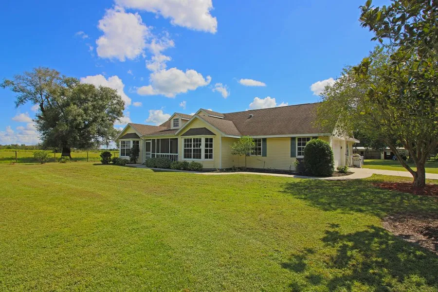 Welcome to the country with 10+/- Acres of beautiful land! Everything you need is here, from the lovely, updated concrete block w/vinyl siding, to a horse barn/with tack room, to a large 40X50 metal barn (2020). The barn, has a car lift that will be left and you can store a Class A RV easily, as well as other toys. There is an additional pad for a generator. The property is fenced and cross fenced. There is a 2 stall horse barn with a tack room with additional parking. The property is secured with an electric elegant gate. There is a large custom built chicken coop so you can raise your own chickens and have plenty of eggs. There is all new vinyl wood plank flooring throughout. The Master Bedroom has a large walk-in closet. The lovely barn door gives privacy to the update master bathroom which has a beautiful claw foot tub. In the water closet room there is a cedar closet for storage. The kitchen is updated with lovely oak cabinets, the stove, Microwave and Built in oven have been upgraded to convection cooking. The range has a air fryer function. The dishwasher is raised to give ease for loading and unloading. There is also a built-in additional oven. The breakfast area allows you to have your morning coffee while gazing out the windows to the beautiful property with fruit trees, oranges, tangelos, pear, olive tree, Guava trees and coffee bean tree. All the TV's, the Bose sound systems, entertainment center, electric "faux" fireplace all convey with sale.