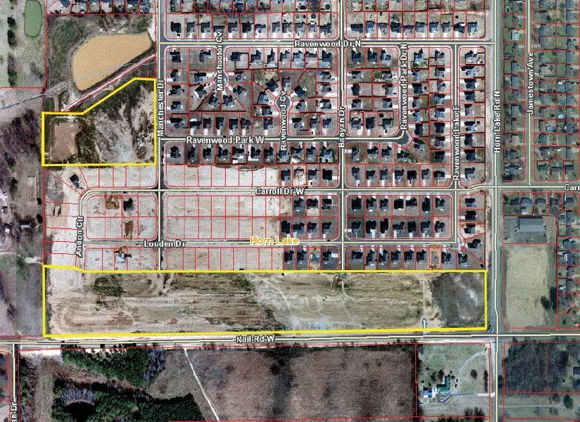 Approximately 23.27 acres of undeveloped land (two parcels) adjacent to the Ravenwood Subdivision in Horn Lake. Both parcels are zoned PUD, Planned Unit Development. The majority of the site is planned for future phases of Ravenwood Subdivision with a small area (approx 2.5 acres on the corner of Horn Lake Rd & Nail Rd) planned for commercial development.