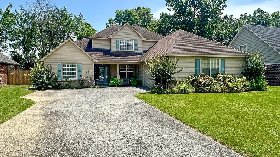 Welcome to this beautifully appointed home blending comfort, character, and convenience. From the inviting front porch and charming 2-story foyer to the crown molding in the den and vaulted ceilings throughout, every detail feels elevated. The kitchen features a built-in microwave, garbage disposal, and flows seamlessly into open living spaces with rich laminate hardwoods and tile. The serene primary suite offers tray ceilings, dual walk-in closets, and a spa-like bath with granite vanity, whirlpool tub, separate shower, and vaulted ceiling. Upstairs bedrooms include ceiling fans, plush carpet, and share a tiled hall bath. A walk-in attic and expandable space provide endless possibilities. Step outside to a covered patio and fully fenced backyard—perfect for relaxing or entertaining. A side-load 2-car garage completes the picture of thoughtful design and timeless style.