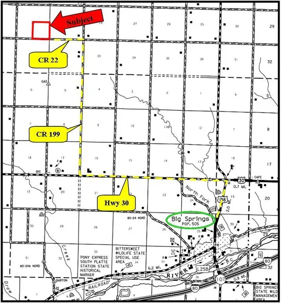 Location: 2 miles north of Big Springs, Nebraska to Hwy 30, 4 1/4 miles west to Cty Rd 199, 4 miles north to Cty Rd 22, 1 mile west on Cty Rd 22 to southeast corner of property.