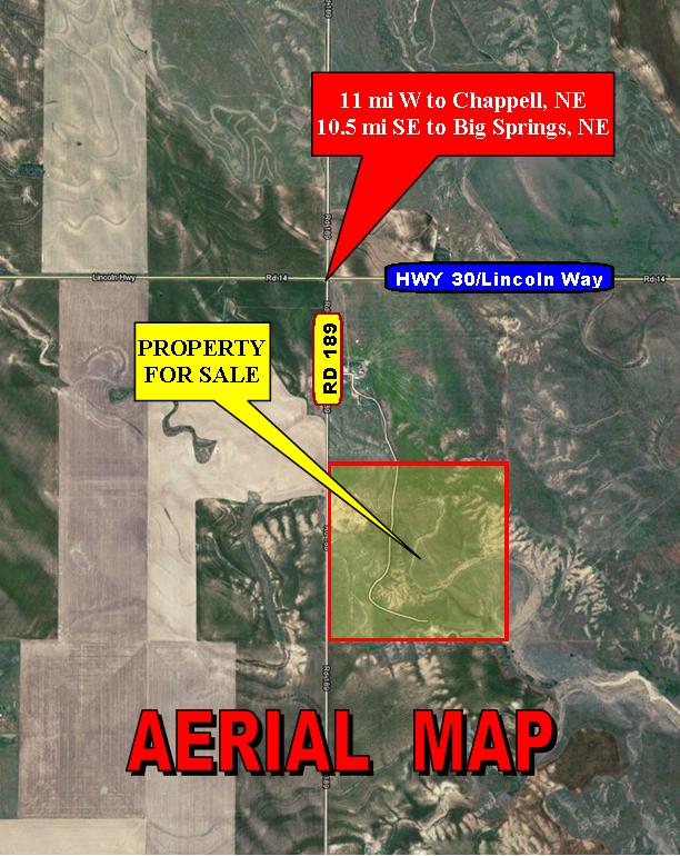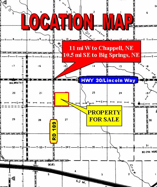LOCATION: From Chappell, NE, 11 mi east on Hwy 30 to CR 189. CR 189 south mile to the northwest corner of the property or from Big Springs, NE, 2 mi N to Hwy 30, 8.5 mi west on Hwy #30 to CR 189. CR 189 south mile to the northwest corner of the property. Property lies on the east side of CR 189.