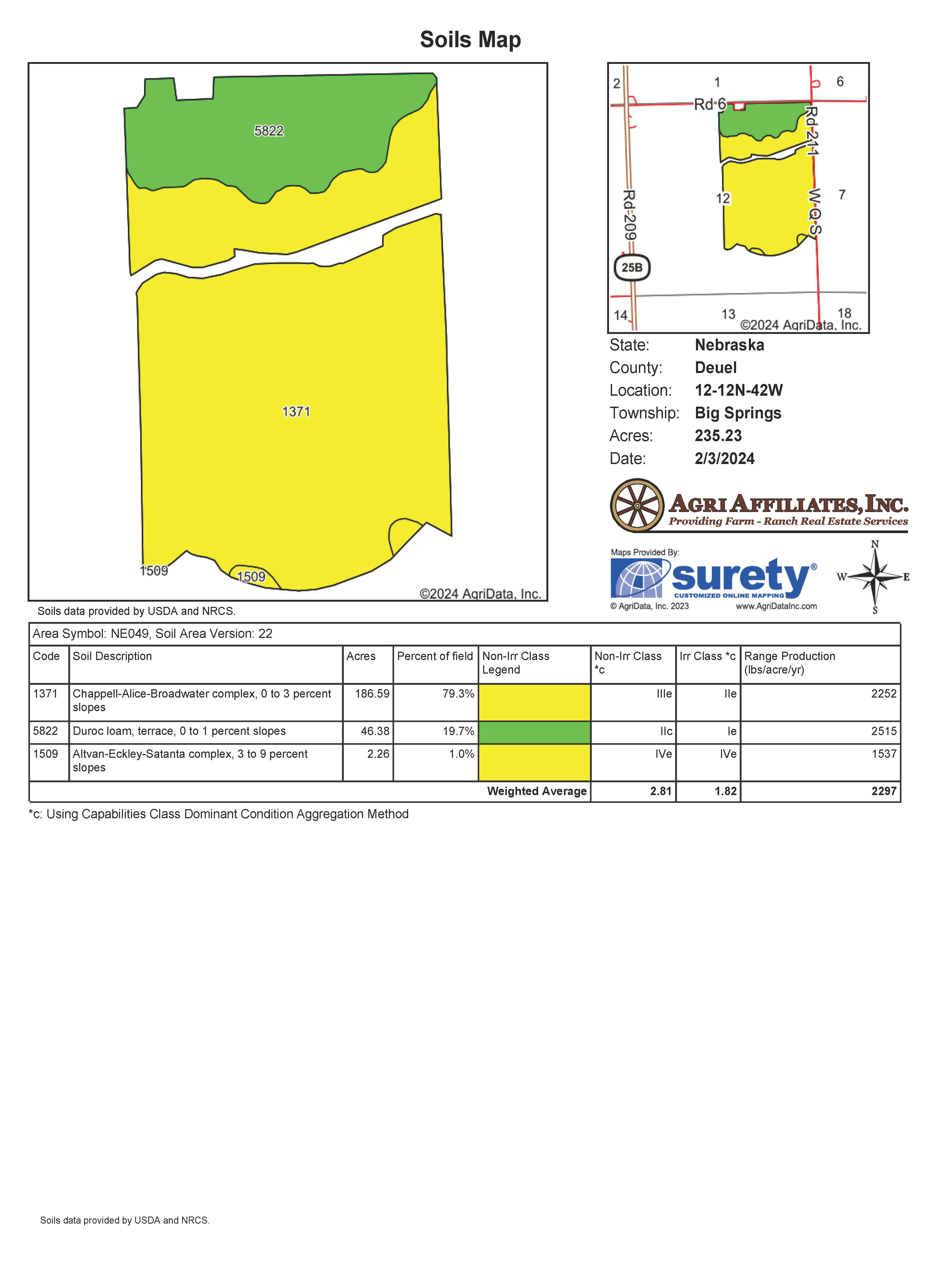 322 acres of productive South Platte river valley farm featuring both ground water and surface water rights. Located 1 mile south of Big Springs, Nebraska.