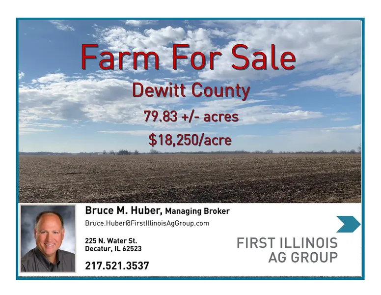 Offered for sale are 79.83 acres of high quality central Illinois farmland. The farm is located in the west central portion of Dewitt County immediately northwest of Clinton, Illinois. Dewitt County is centered between, Bloomington, Springfield and Champaign, Illinois. The soil types on the sale property are Buckhart, Peotone, Ipava, and Sable soils with an overall tillable soil productivity index of 138.2. The property is 98.6% tillable. The property is nearly level and is being offered at $18,250 per R.E. Tax acre. This is an excellent opportunity to add to your farming or investment portfolio.