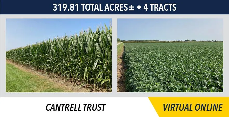 The Cantrell Trust farms will be sold on a price per acre basis, based on surveyed acres for Tracts 1-3 and based on taxable acres for Tract 4. All 4 tracts will be offered through the marketing method of Buyers Choice, whereas the high bidder can elect any of the tracts for their high bid. If the high bidder does not elect all offered tracts, then the remaining tract(s) will continue to be offered Buyers Choice until all tracts have been elected. The tracts will NOT be offered in their entirety at the conclusion of the auction.