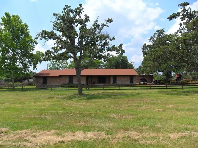 Three bedroom, two bath, office or fourth bedroom brick home on 11.54+/- oak-covered acres. All electric. Split bedrooms, island in kitchen w/electric stove. Large dining room, corner fireplace in living room, patio with metal cover. Three stall barn on dirt and tack room. Three car metal garage / workbench, electricity, 220, & water on slab. Borad fencing around yard. Coastal, post oaks, cross-fenced, Hwy. 72 frontage.