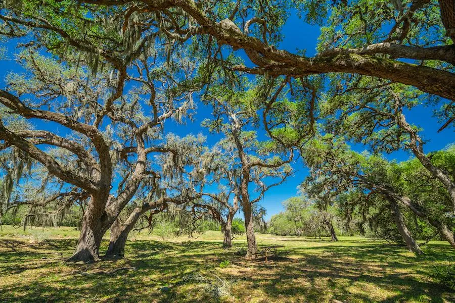 Approximately 175 acres have been maintained and operated as hay fields with improved Tifton 85 grass among other varieties. The perimeter is completely high fenced and the interior of the ranch is traversed by a network of barbed wire fences designed for rotational grazing of livestock. Cattle guards are located strategically so that your evening cruise can be uninterrupted by the need to open gates. It has already been mentioned several times, but the giant population of centuries-old oak trees is simply not to be believed.