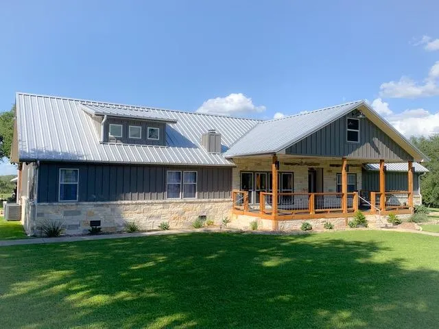 RUSTIC OAK RANCH is on the market! Your drive down the Oak-arched driveway through this 50-acre property opens up to a exquisitely manicured estate with 10-mile views of rolling terrain and a 3100 sq.ft. Modern Farmhouse. Home is thoughtfully designed and outfitted with high end finishes and custom touches throughout that increase comfort and convenience for homeowner. Beyond the massive front and rear porches is a 2 acre fully irrigated and landscaped yard, complete with pool, gas supplied fire ring, outdoor pavilion housing full kitchen, entertainment area, fireplace, full bath, and enclosed pool room, and pea gravel playground complete with trampoline, see-saw, and playhouse. Enjoy fresh fruit from a line of fruit trees on one side of the house and enjoy plenty of parking in the oversized lighted Carport on the other side. The property also contains a 40x60x16 dream-shop, a 30x50x14 3-Side Equipment Shed, and an 8x40x9 High-Cube Storage container (has been insulated and is climate controlled). Due to seclusion and lay of the land, there is potential for multiple homesites, three of which are already set up with power, water, and septic. Although property is loaded with large and beautiful Live Oaks, there is plenty of Pasture with improved grasses for livestock. Back property line is Cuero Creek, a seasonal creek. Be sure to check out Facts and Features for more details!