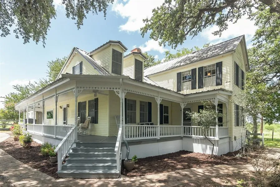 4/3 renovated farmhouse, away from big city noise & traffic. Built in 1850 by Gonzalvo Woods, part of prominent early TX Patriot family. Updated kitchen w/granite countertops, custom lower cabinets constructed on site made of longleaf pine reclaimed by current owner from an 1850's New Ulm, TX, home. SS appliances, floors rare wide-planked long leaf pine. Bathrooms w/unique tile work, custom cabinetry. Wrap around porch shaded by grand old oak trees. Wildlife wander by each day, including deer, Mexican Whistling Ducks, turkey, dove, grey & red fox, bobcats & myriad of bird species. Property is fully fenced and cross-fenced w/7 pastures w/piped water troughs throughout. Live spring fed creek. Stocked tank w/Large Mouth Bass, Hybrid Catfish, Hybrid Striper, 3 types of perch, 3-4 species of minnows. Garage w/built-in work area & outdoor shower w/dedicated water heater. 1930's barn w/adjoining metal pens. Property offers country living at its finest w/too many great features to list.