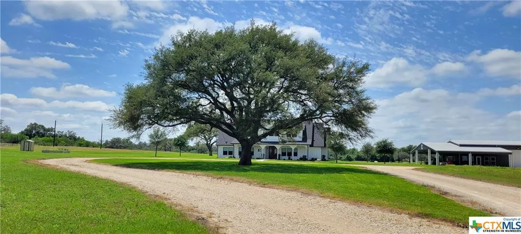 Absolutely beautiful property, a rare find in the area. Has it all, gorgeous new custom home, fenced-in pool, shop, acreage, and stocked pond with a building with 1/2 bath. Every detail was attended to when creating this 1 of a kind home. Has 5 bedrooms and 3 baths on the first floor and a bonus space and extra-large bedroom and bath on the second. 2 on demand gas water heaters, custom and electric shades, 8' doors, 2 water wells, acres of irrigated carpet grass, 2 septic's, buried 500-gallon propane tank, commercial water softener are a few of the extra touches that make this place amazing. Smart features throughout the home. The immaculate shop with 1/2 bath has parking for several vehicles plus toys and still plenty room for entertaining. The pool and hot tub are both gas heated as well as the firepit. Cool decking around the fenced-in pool. The outdoor patio includes a gas fireplace, flat top grill and pellet grill. 2 hrs. to SA, Houston, Austin, or CC
