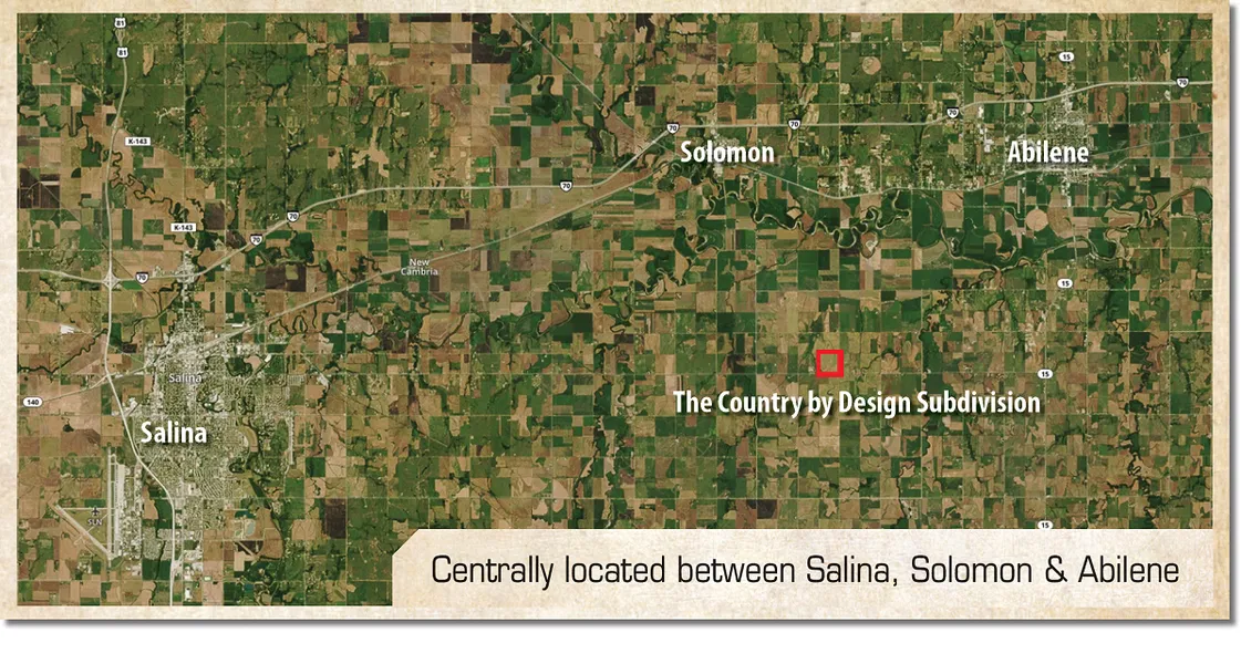 161.13 acres of residential development land, located at the corner if 1700-Rd and Daisy Road in Dickinson County, Kansas, is being offered for sale. The Country by Design Subdivision is centrally located 8-miles southeast of Solomon, 10-miles southwest of Abilene, and 15-miles east of Salina on Country Club Road.