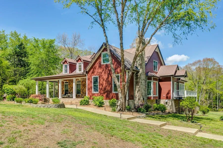 Private and secure property with striking custom home tucked between beautiful rolling fields and wrapped by gorgeous Barron Fork Creek. Featuring an open floor plan, large kitchen with 3 ovens plus an additional kitchen in basement, wet bar areas, huge flex room, covered front porch and covered back porch overlooking lush lawns/creek, in-ground pool, in-law suite. Barn with 7 stalls, electricity and water, mostly fenced, garden spot. Perfect getaway property well under one hour to Nashville.