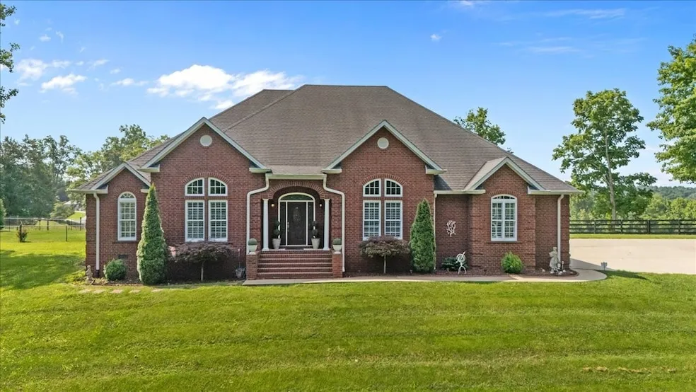 Custom-built in 2005, this all-brick, one-level home sits on a lush 1.15-acre lot in Burns, offering timeless elegance and privacy. The chef s kitchen complete with cherry cabinets to the ceiling, lighted glass uppers, granite countertops, double ovens, gas range, and a butler s pantry with a new wine chiller flows seamlessly into a great room anchored by a stacked-stone fireplace. An adjoining sunroom floods the space with natural light and overlooks the private, level backyard oasis, where $20K in mature landscaping frames a concrete firepit and extended patio beneath a custom pergola. Hardwood floors and tile run throughout (no carpet), while formal dining and a living room/office both feature soaring 12-ft ceilings and custom plantation shutters. The primary suite boasts a spacious walk-in closet with built-ins, and a bath with dual vanities, a jetted tub, and a huge linen closet. Down the hall, a second bedroom also has a fireplace and generous walk-in closet, and the third bedroom grants access to unfinished attic space pre-plumbed and wired for a future bonus room. The shared bath even offers a steam shower with seating. Practical updates include two water heaters and HVAC units replaced just two years ago, plus a large laundry room off the kitchen and garage with sink, countertops, and cabinetry. Just minutes from Fairview, Dickson, and I-40, this one-level retreat combines modern conveniences with classic style and entertaining flair.