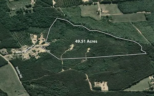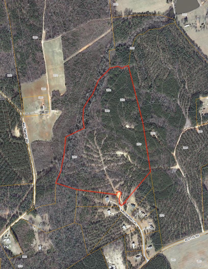 49.51 wooded acres being Dinwiddie County tax parcel 54-30. It is located at end of Archangel Place (Queen of Angels subdivision). It is ideal for a private residence or future development. It is preliminarily planned and perked for 13 lot future expansion of Queen of Angels subdivision. There are trails through property. It is zoned RR-1, rural residential but the new owner may be able to revert it to A-2, general agricultural (any rezoning must be approved and not guaranteed). The property does have restrictions (see downloads) and proffers are in place for development. Perc information available.