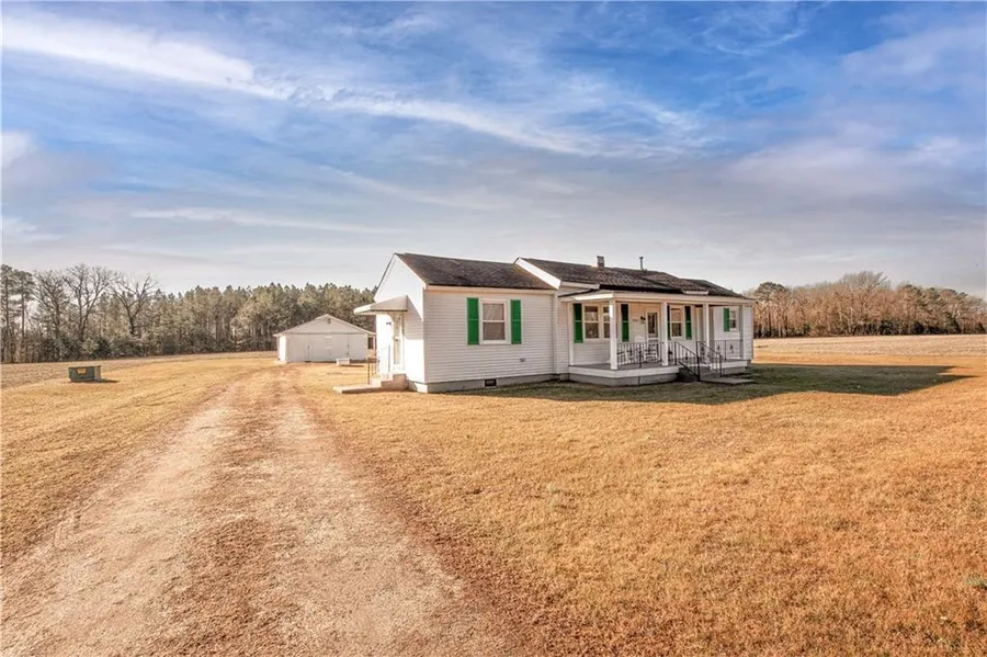 Front Porch living!! This renovated home sits on 3 acres of land with beautiful views in North Dinwiddie. The home features a large country front porch as well as a 2 car detached garage with lean-to surround for extra storage. Entering from the front of the home you will find a spacious living room to your left and a large family room to your right that could also be used as a dining room. Both rooms feature newly refinished hardwood floors. Entering the kitchen you will find fully refinished cabinets, new stainless steal appliances and a large pantry. The primary bedroom is quite large! The second bedroom also features new carpet. There is a 3rd room being used as an office that could very easily be used as a 3rd bedroom as well. The bathroom has been fully renovated with new tub/shower, flooring, vanity, and paint. On the rear of the home you will find a second entrance from out side into a mudroom/laundry room. The home features Brand New HVAC, electrical, paint throughout, drop ceiling tiles, windows, window blinds, concrete steps, and newer roof. The land has also just been surveyed for you to see the parcel with ease when showing.