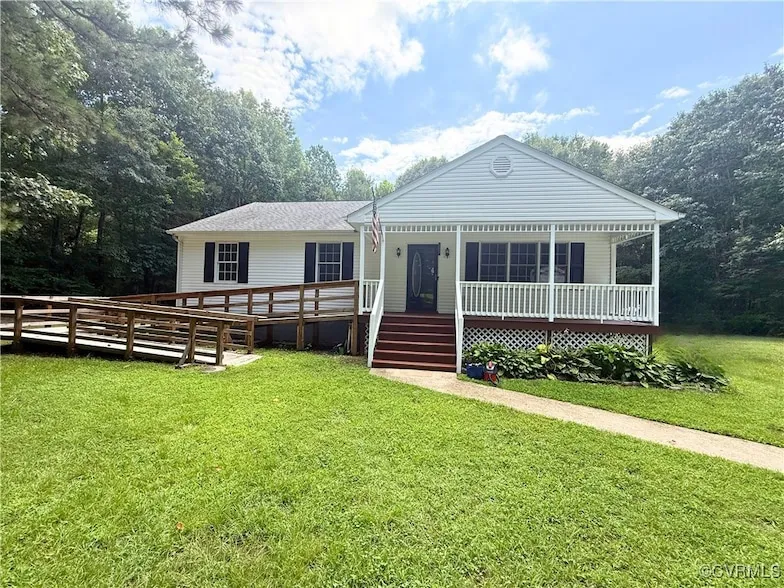 Move-In Ready Ranch on 1.7 Private Acres Just 15 Minutes from Petersburg, Colonial Heights & Fort Lee!Welcome home to this beautifully updated ranch-style retreat nestled on a peaceful, wooded 1.7-acre lot. Freshly painted inside and featuring brand-new flooring throughout, this home offers modern comfort with a touch of country charm. Enjoy morning coffee on the inviting country front porch or entertain on the spacious 12' x 21' rear deck, both recently refreshed. The ADA-accessible ramp and features throughout make this home ideal for a variety of needs. Inside, you ll find a bright vaulted ceiling great room complete with a cozy gas fireplace perfect for relaxing evenings. The eat-in kitchen boasts hardwood floors and flows into a generously sized utility/laundry room for added convenience. The primary suite is a true retreat with dual closets, a newer oversized ADA walk-in shower, large vanity, and a spacious linen closet. A second bedroom can serve as a guest space or private home office. Other updates include a newer heat pump, new hot water heater, new dishwasher, newer LVP flooring, new carpet, and fresh interior paint throughout, making this home completely move-in ready. Whether you're seeking quiet country living or convenient access to nearby cities, this charming home offers the best of both worlds. Schedule your tour today!
