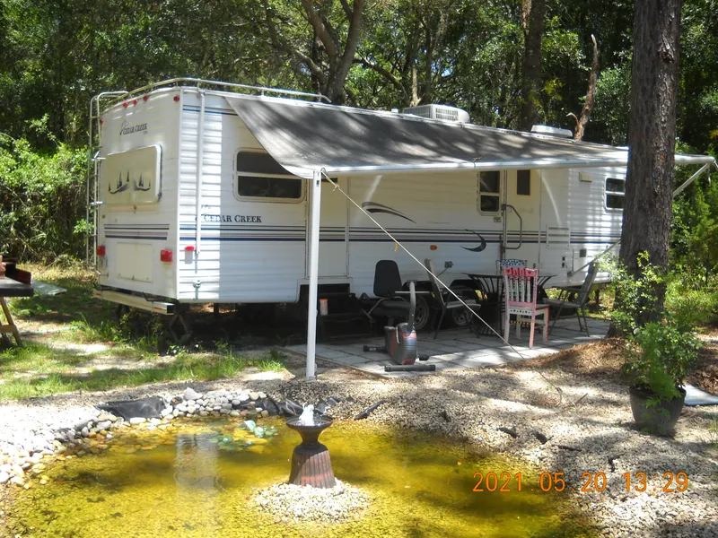 WHAT A RARE FIND! The work has been done! This 1/1 RV with utilities already in place would make the perfect get away place. Features 28 ft. 2000 Cedar Creek RV in good condition, new window ac unit & refrigerator. Renewable Permit, Survey, 4 inch submersible well, power pole all tin working order. Situated on a dead end street on a partially fenced, pretty .47 acre lot within 8/10ths of a mile to the Suwannee River Park and boat ramp at Turner Point Landing. An added feature is a graveled gold fish pond with waterfall. Extra feature and for an additional $10,000 you can have 2000 Macgregor Sailboat w/ 2005, 75 hp mercury 2 stroke/trailer all in good condition. View this one today! Will not last long!