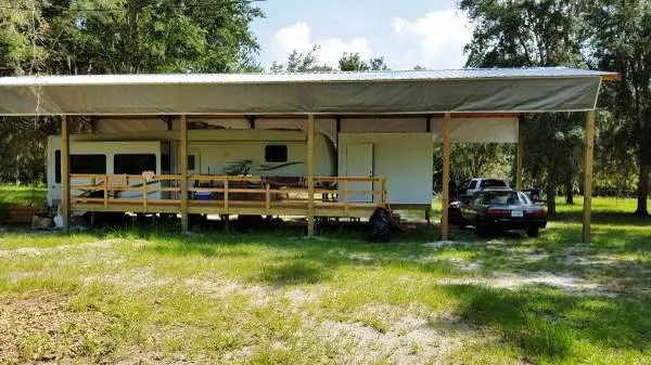 36ft Fifth Wheel, Triple Slide, 2006 Camper under brand new24x60 pole barn. Brand new 12x36 deck with 12x12 shed built on the deck. It has laundry hookups and additional toilet in it. Holding tanks have been eliminated and regular toilet installed inside the camper. 5 acres partially fenced. Good clear ground ideal for horses, with some trees for shade. Large pond in rear of property, boundary corner is in the pond Close to Garnto Springs County Park. Swim in the Springs while having a picnic. Use the Boat Ramp to hit the Historic Suwannee River. Two Separate Tax Parcels So you could add another Residence.