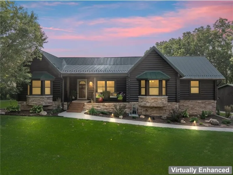 This is it! Your peaceful, little heavenly get away. Tucked away on a beautifully landscaped 1.2-acre lot, this impressive custom-built log home offers the perfect blend of rustic charm and modern comfort. Located on a quiet cul-de-sac this property is just 20 minutes from Rochester and offers school options in both Triton and Kasson-Mantorville districts. Inside, you’ll be greeted by soaring vaulted ceilings, dramatic exposed beams, cedar-paneled walls, hardwood floors, and sun-filled skylights that bathe the space in natural light. The open living room features a stunning floor-to-ceiling stone gas fireplace, pine ceilings and flooring, and walks out to a spacious 19 x 30 deck—ideal for entertaining or simply enjoying the peaceful surroundings. With 3,500 sq ft of finished space, this home offers a thoughtfully designed layout with a main floor primary bedroom retreat and private bath, main floor laundry with built-in cabinetry and deck access, and a fully finished lower level with a custom bar for hanging out with family and friends.