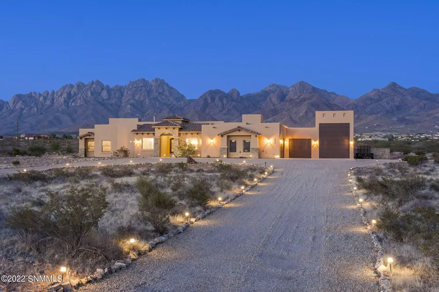 VIEWS, VIEWS, VIEWS!!!! Magnificent custom home on scenic 5 acres! 5 Bedrooms plus office/den, 3 Baths, 3 car garage plus attached RV garage with 12x14' tall garage door, and 3,545 SF. Enjoy the exquisite Southwest Contemporary finishes as you enter through the grand iron door. Captivating Great Room w/soaring ceilings, beams, and incredible views. Stunning Chef's Kitchen features stainless steel appliances, custom soft close wood cabinets, granite counters, large island, and eating area. Large primary suite has a spacious walk-in closet and gorgeous mountain views. Ensuite Bath features a beautiful tiled shower, jetted tub, and double sinks with granite countertops. The home has a split floor plan with spacious secondary Bedrooms. The large East facing tiled back patio has amazing views of the Organ Mountains. There is a 3-car garage + a 41 feet deep RV garage. Many custom features including solid wood doors, Pella windows, suspended lights and a tankless water heater. This is a must-see home.