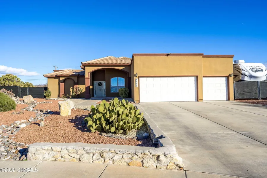 Beautiful home with a great open floor plan with 4 bedrooms, 2.5 bathrooms, Office/Flex Room, and 2,442 square feet. High ceilings with crown molding plant ledges, excellent lighting, plantation shutters, and tile in living areas. The Living Room has a beautiful corner brick fireplace with access to the patio. Gourmet Kitchen, with loads of custom wood cabinets, pull out shelving, granite counters, stainless steel appliances including new microwave and dishwasher, and an eating area. Office with French doors could be used as a Formal Dining Room. This is a split bedroom plan features the Primary Suite with En-Suite Bath with jetted tub, stall shower and custom cabinets with double sinks. There are 3 other Bedrooms, one of which opens to the hall Bath to create a Guest Suite. All Bedrooms have brand new carpeting. Completely landscaped grounds with large extended patio, shading patio in evenings. Partial view of the mountains - large 3 Car Garage is deep with workshop area!