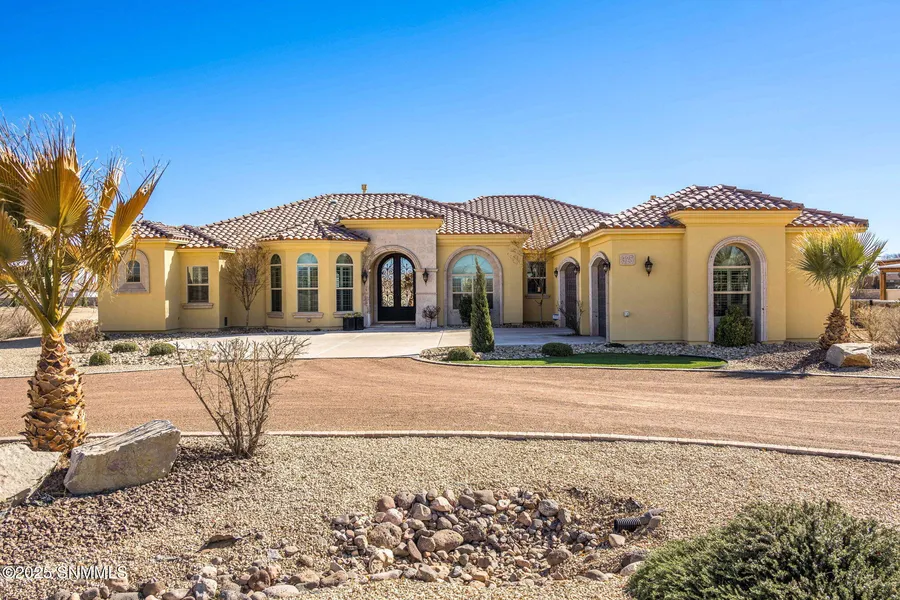 This stunning Mediterranean-inspired home is situated on a full acre in the prestigious Mesilla Vineyard Estates. The property encompasses 3,983 square feet and features 4 bedrooms, 3.5 baths, an office, and a flex room. The extensive use of Cantera Stone throughout the house, along with coffered and tray ceiling treatments and Venetian plaster, makes it a truly custom residence. The welcoming formal living room includes a wet bar with a wine cooler and offers beautiful views of the vineyard and valley. The gourmet chef's kitchen boasts exquisite custom cabinets and intricate tile work. Additionally, there is a formal dining room and a dual-zone Bluetooth-capable surround sound system. Plantation shutters adorn the windows, enhancing the home's elegance. The spacious primary bedroom includes a sitting area and a spa-like ensuite bath. The incredible outdoor living space can be accessed from both the great room and the master bedroom.