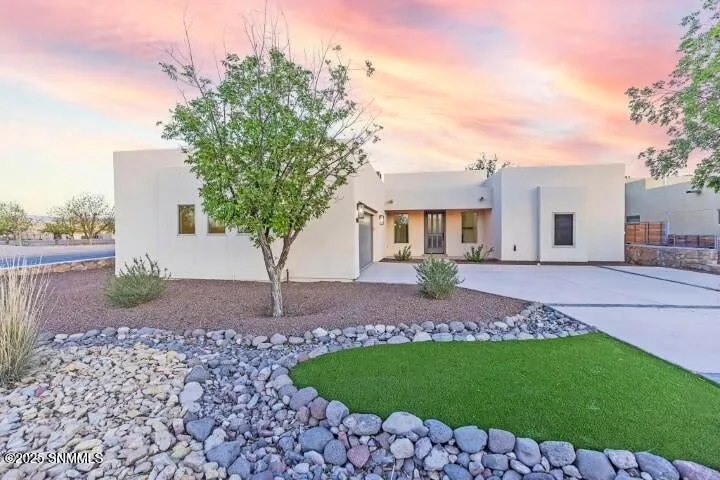 Modern living in historic Mesilla! Located just two blocks from the plaza, this stunning 2022 adobe-style home sits on a beautiful 1/3-acre lot. The main house features 3 spacious bedrooms with 3 baths, a large great room with soaring ceilings and huge ceiling fan, a gas fireplace, a dining space, and laundry room. The gourmet kitchen boasts a 6-burner stove, cabinet-mounted microwave, large island, quartz / granite countertops, champagne bronze fixtures, a coffee bar, and built-in beverage fridge. The primary suite includes patio access, a soaking tub, and a large walk-in shower. Outdoor amenities include a back patio, ceiling/patio fans, , mature trees, Oversized large 2-car garage. Truly one-of-a-kind! Never lived in!