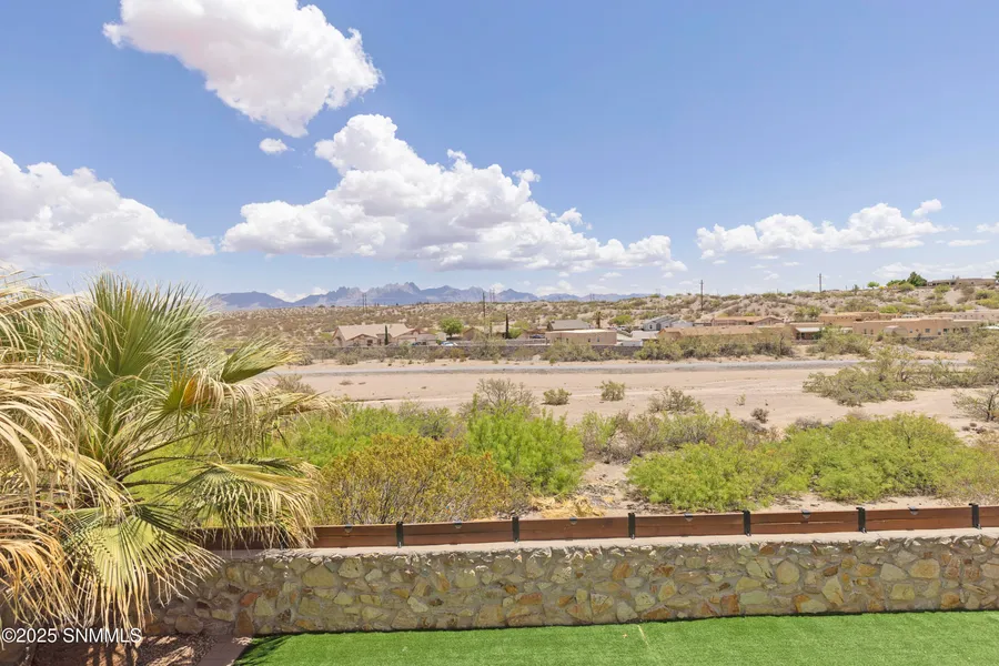 Enjoy Organ Mountain views from your own backyard in this 3 bedroom + a large flex room, 2.5 bath home with approximately 2,380 sq. ft. of living space. The backyard is a true retreat with artificial grass and a covered patio that is perfect for relaxing or entertaining while soaking in the scenery. Inside, you'll find two living areas, a large flex room for a home office or gym, or an extra bedroom, an open kitchen with granite countertops, an island, stainless steel appliances, ample storage, and much more. Upstairs, the spacious primary suite offers a remodeled bath and a balcony with panoramic views. Additional highlights include recessed lighting, ceiling fans, a mix of vinyl wood, tile, and plush carpet flooring, and a storage shed out back. Located near Hwy 70 and I-25 for easy commuting. Available for immediate occupancy. Don't miss the chance to own this view!